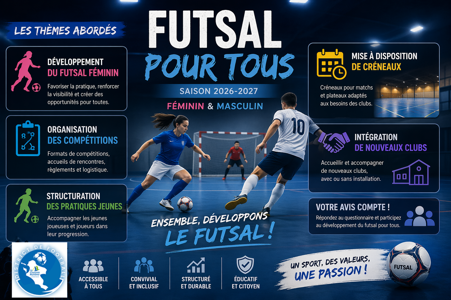 Futsal pour tous – Saison 2026-2027 (Féminin & Masculin) Dans le cadre de la préparation de la saison 2026-2027, nous poursuivons le développement du futsal sur notre territoire. Afin de...